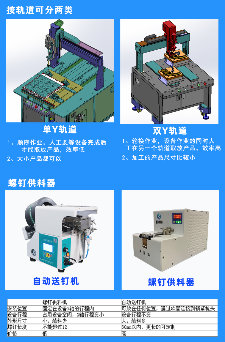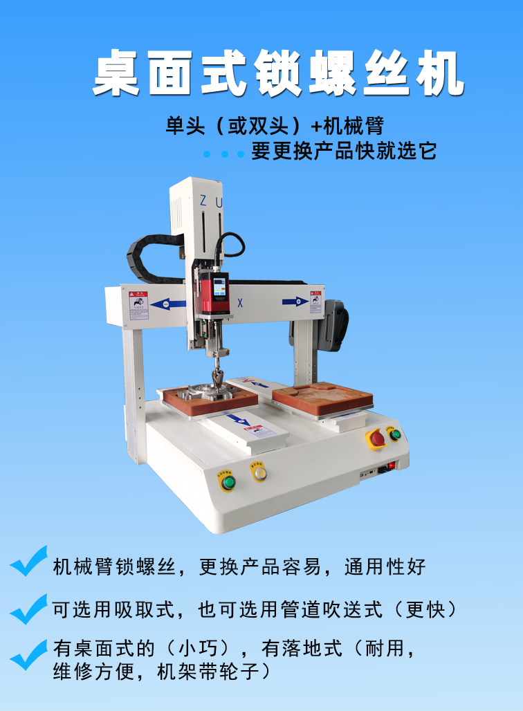 桌面型自動鎖螺絲機,主打是小規(guī)模半自動生產(chǎn)線。具有小型輕巧,可雙Y軸同步交替作業(yè),提升生產(chǎn)效率;螺絲通用性好,通過更換螺絲送釘機或螺絲盒可實現(xiàn)通用M1.0~M4的螺絲,適合