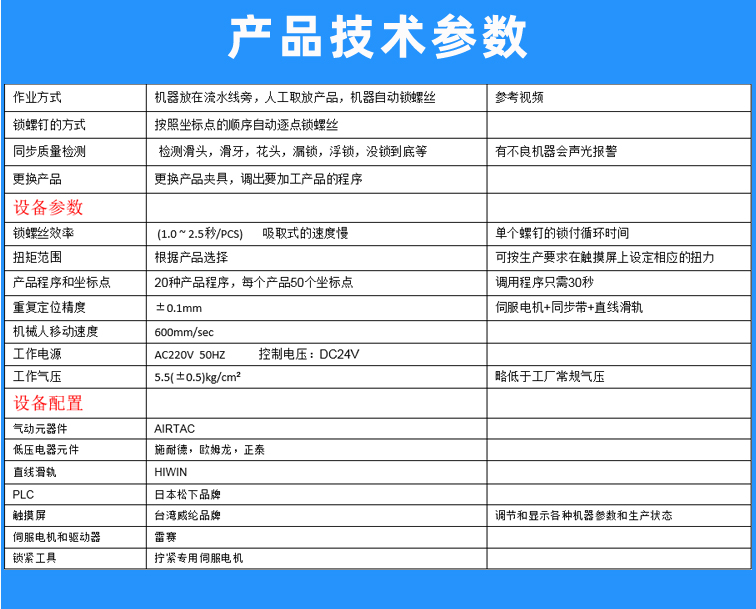 | 產(chǎn)能 | 1.0~1.5秒/PCS | 單個鎖付螺絲循環(huán)時間 |