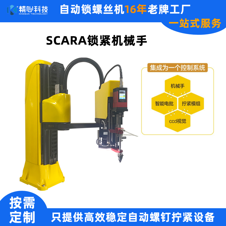 精心科技16年來一直專注螺釘鎖緊、輸送領域。經過不斷的研發創新,將機械手、智能電批、擰緊模組和CCD視覺檢測集成為一個控制系統,在簡便設備的操作使用的同時還能精準高效的鎖附螺釘。通過單元間的配合使用,鎖緊機械手可以適用更多的尺寸和應用場景。精心科技鎖螺絲機械手擁有先進的自主學習功能,讓操作變得更加簡單。